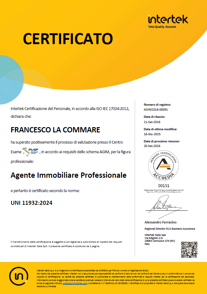 Intertek Certificazione del Personale, in accordo alla ISO IEC 17024:2012, dichiara che Francesco La Commare, esaminato dall'Exam Center Fiaip, è certificato per la figura professionale di: